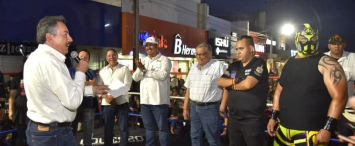 “Estamos de fiesta en el marco de las festividades del Día de la Niña y el Niño, este mes de abril celebramos la vida de los niños y niñas que son el sol, son la esperanza y el futuro, por eso el Ayuntamiento esta realizando una serie de eventos para acercarnos a los menores y llevarles alegría, este día vamos a presentar una lucha espectacular de los técnicos contra los rudos, por eso lucharán de dos a tres caídas y sin limite de tiempo el Capitán del Deporte junto con Visión de Futuro y del otro lado el Tóxico y el Mañoso, que empiece la lucha libre, viva Cajeme y que vivan las niñas y los niños», expresó el munícipe al fungir como el anunciador oficial de la lucha principal de los Héroes del Barrio.