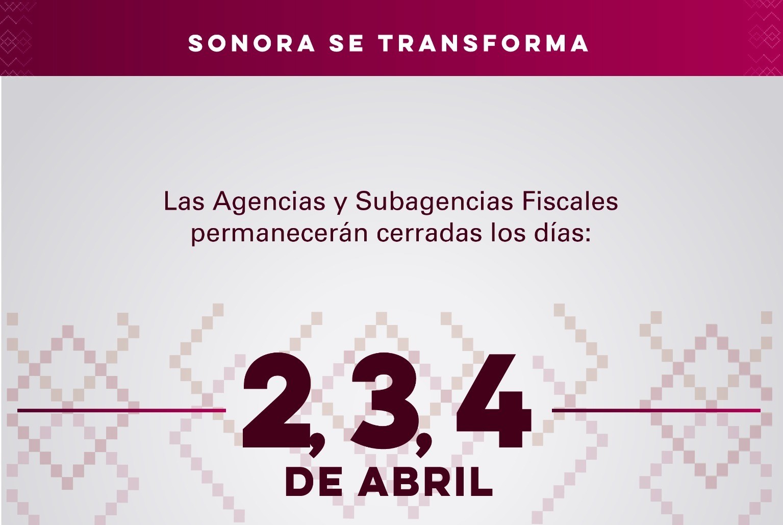 Hermosillo, Sonora; 30 de marzo de 2026.– El Gobierno de Sonora, a través de la Dirección General de Recaudación de la Secretaría de Hacienda, informa a los contribuyentes que las 27 Agencias y Subagencias Fiscales del estado permanecerán cerradas los días 2, 3 y 4 de abril durante el periodo de asueto por Semana Santa y se reanudarán operaciones en horario normal el lunes 6 de abril.