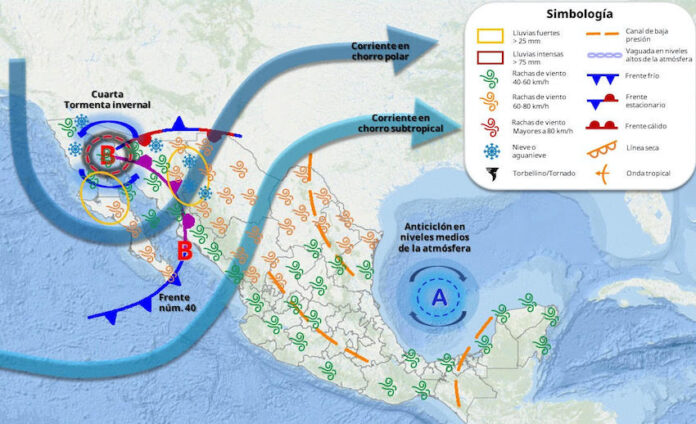 Durante hoy, la cuarta tormenta invernal en combinación con el frente frío (núm. 40) y las corrientes en chorro polar y subtropical sobre el noroeste de Sonora originarán descenso de temperatura con un ambiente de frio a fresco, fuertes rachas de viento sobre el norte y oriente. Aunado a esto, durante la tarde-noche de hoy impulsará inestabilidad para la generación de tormentas con precipitaciones moderadas sobre todo el territorio estatal, estás condiciones podrían venir acompañadas de descargas eléctricas y posible caída de granizo sobre municipios del centro, norte, noroeste, noreste y sur. Asimismo, se mantiene la probabilidad de caída de nieve/aguanieve sobre el sector montañoso del oriente y noreste