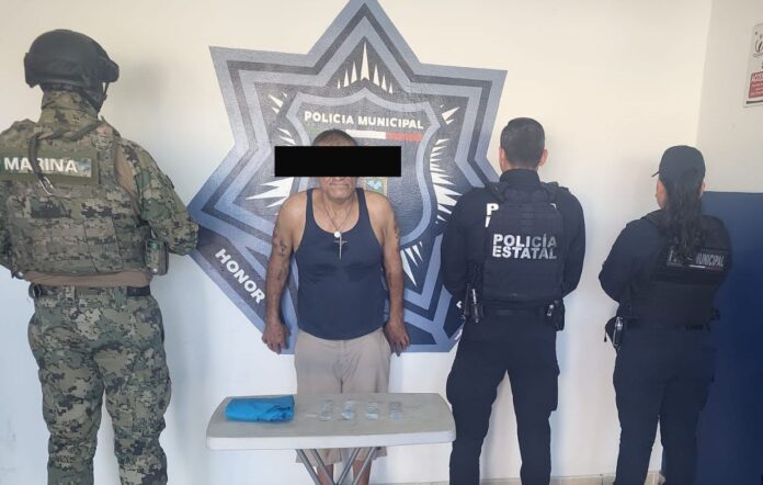 Derivado de las acciones operativas implementadas en el lugar, fue detenido Juan Ramón “N.”, de 62 años de edad. Durante la intervención, se aseguraron 28 envoltorios confeccionados en plástico transparente, los cuales contenían una sustancia granulada de color azul con características similares a la metanfetamina.