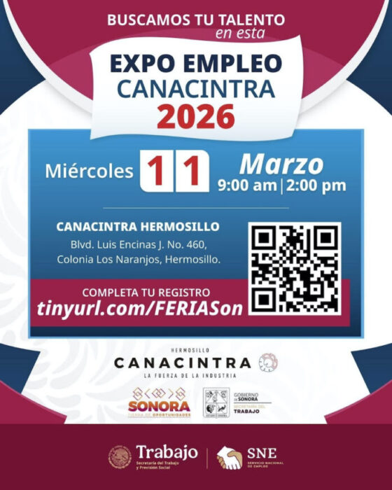 Hermosillo, Sonora.- Para generar mayores oportunidades de empleo, el Gobierno de Sonora, a través de la Secretaría del Trabajo, en colaboración con Canacintra Hermosillo, realizará la segunda Expo Empleo.