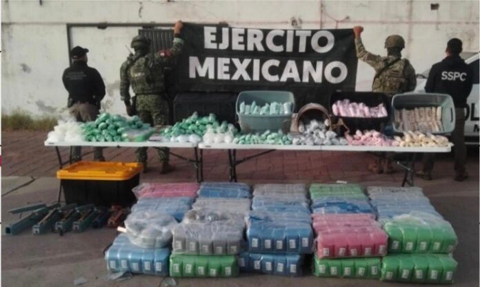 Durante el operativo encabezado por elementos del Ejército Mexicano, en coordinación con autoridades estatales, fueron decomisados 25.690 kilos de metanfetamina y 26.640 kilos de cocaína, además de seis selladoras y 26 bultos de bolsas para empaque.