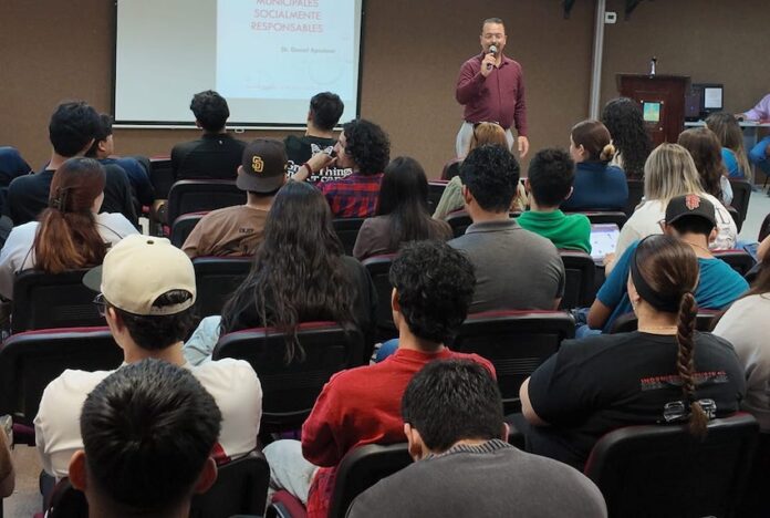 Guaymas, Sonora.- El tesorero municipal de Guaymas, Daniel Apodaca Larrinaga, impartió la plática “Finanzas Municipales Socialmente Responsables” en el Instituto Tecnológico de Sonora (ITSON), unidad Guaymas, con el propósito de fortalecer la formación académica de estudiantes universitarios.