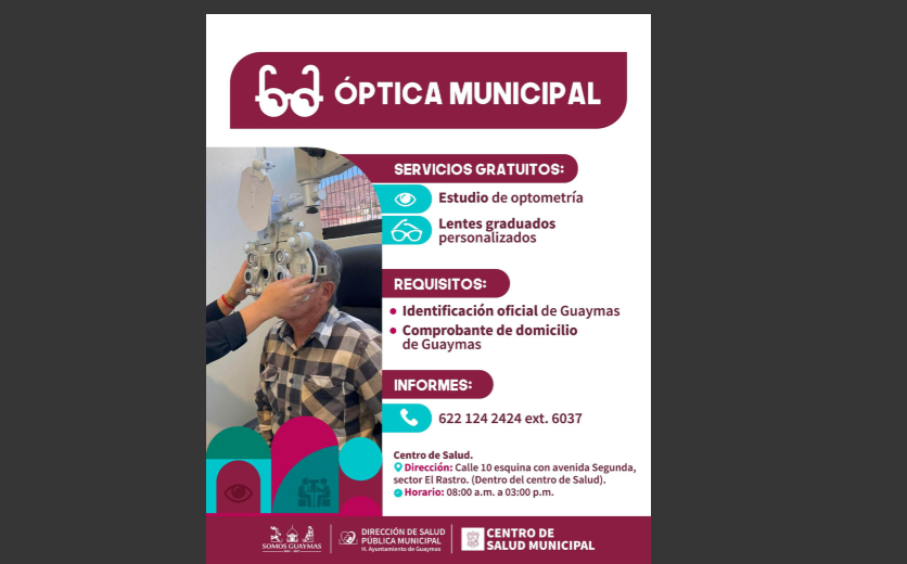 Guaymas, Sonora, .- El Ayuntamiento de Guaymas en coordinación con la Dirección de Salud Pública Municipal informa que a través de la Óptica Municipal, se ofrecen servicios gratuitos, como estudio de optometría y lentes graduados personalizados, sin costo alguno para las familias.
