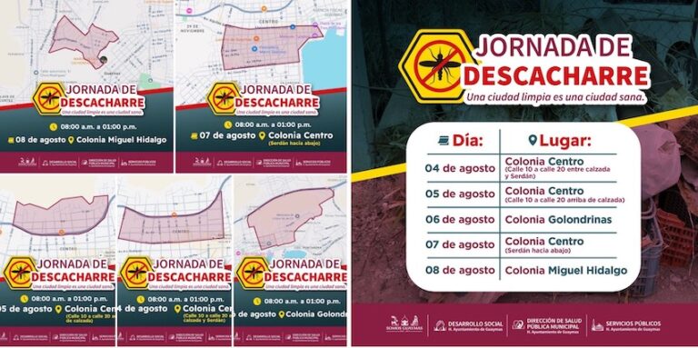 Guaymas, Sonora.- Del 04 al 08 de agosto, el Ayuntamiento de Guaymas a través de Desarrollo Social, Salud Pública Municipal y Servicios Públicos tendrá Jornada de Descacharre en el sector Centro, las Golondrinas y Miguel Hidalgo, esto como parte del compromiso de la doctora Karla Córdova de trabajar en la prevención de zika, dengue y chikungunya.