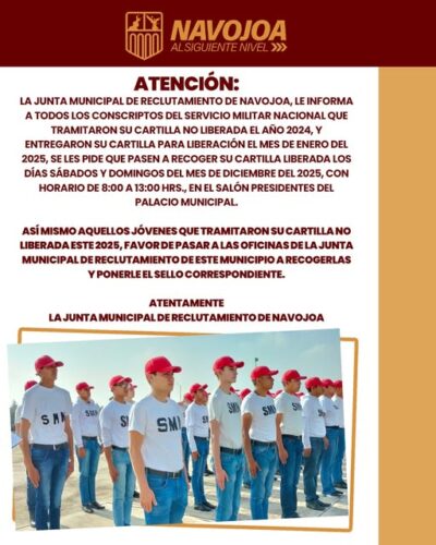 Navojoa La Junta Municipal de Reclutamiento de Navojoa informa entrega de cartillas 5 diciembre, 2025 FacebookTwitterPinterestWhatsApp