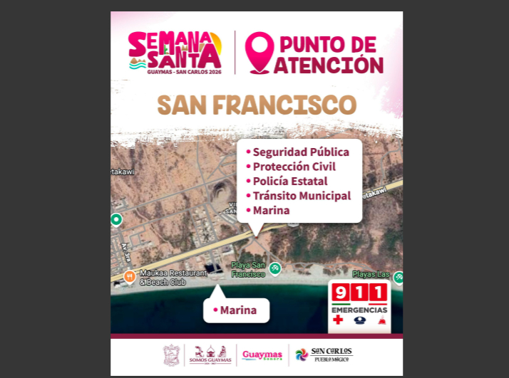 La playa San Francisco contará con punto de atención en estas vacaciones de Semana Santa a cargo de elementos de Seguridad Pública, Protección Civil, Policía Estatal, Tránsito Municipal y Marina te brindarán apoyo en caso de alguna emergencia.