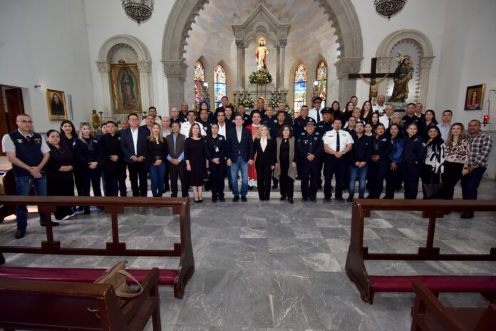 En la parroquia del Sagrado Corazón de Jesús fue oficiada misa a la corporación, estando presentes Elías Retes, su esposa y presidenta del DIF, Luz Argel Gaxiola de Elías, diversas autoridades de Seguridad Pública, regidores y funcionarios.
