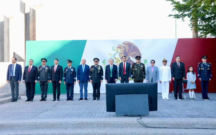Durante su mensaje, el mandatario estatal subrayó que la bandera nacional representa siglos de identidad, lucha y compromiso, además de reflejar el juramento que convoca a las y los mexicanos a honrarla con responsabilidad y sentido de pertenencia.