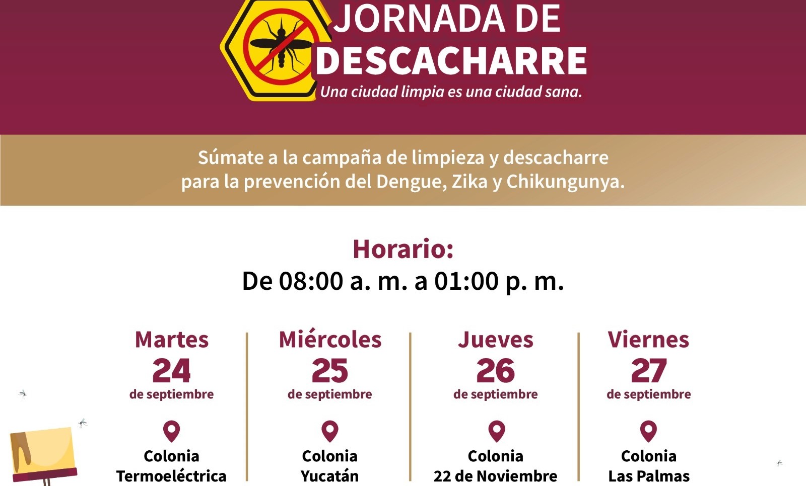 Guaymas, Sonora, 23 de septiembre de 2024.- Como una medida para prevenir casos de dengue, zika o chikungunya, el Ayuntamiento de Guaymas programa Jornada de Descacharre en los sectores Termoeléctrica, Yucatán, 22 de noviembre y Las Palmas.